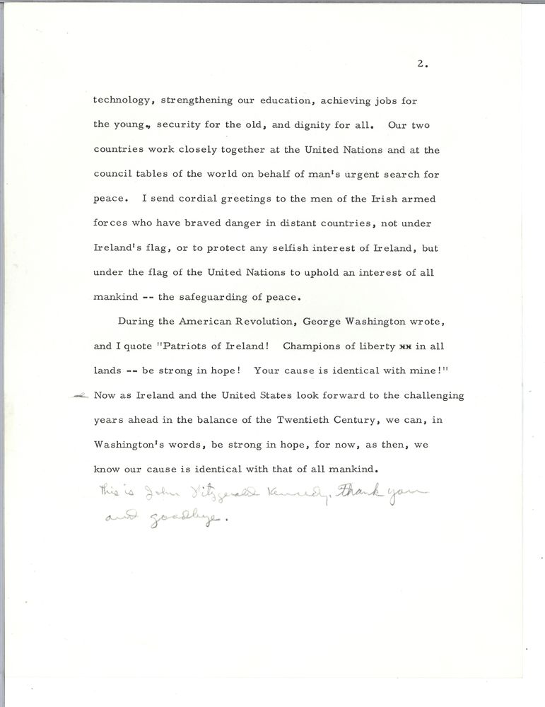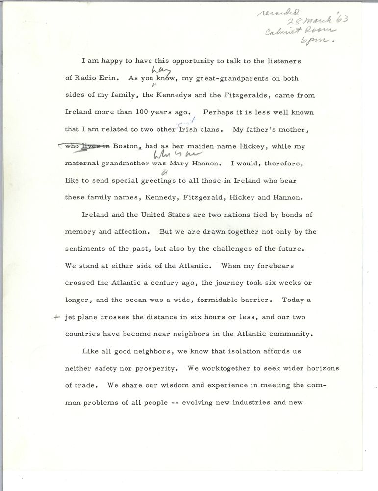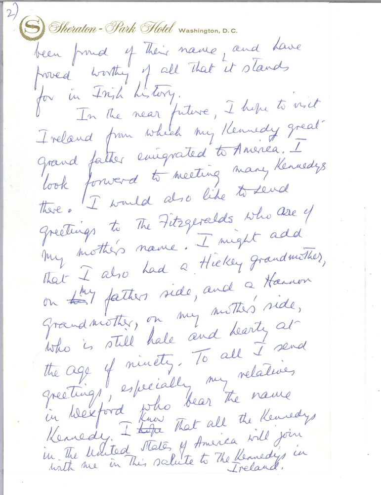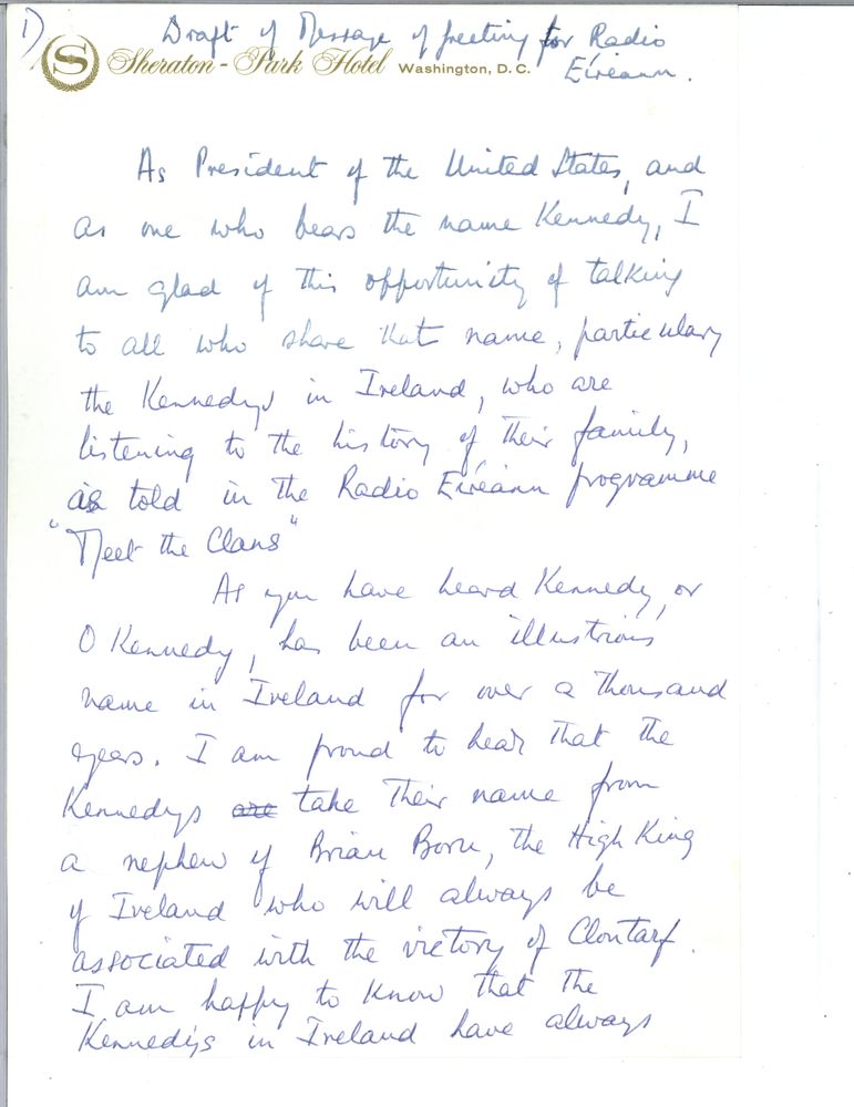 Listen to the three minute broadcast. Below are notes prepared for address and initial draft hand written by Kennedy on Sheraton Hotel notepaper.