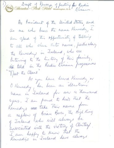 Listen to the three minute broadcast. Below are notes prepared for address and initial draft hand written by Kennedy on Sheraton Hotel notepaper.
