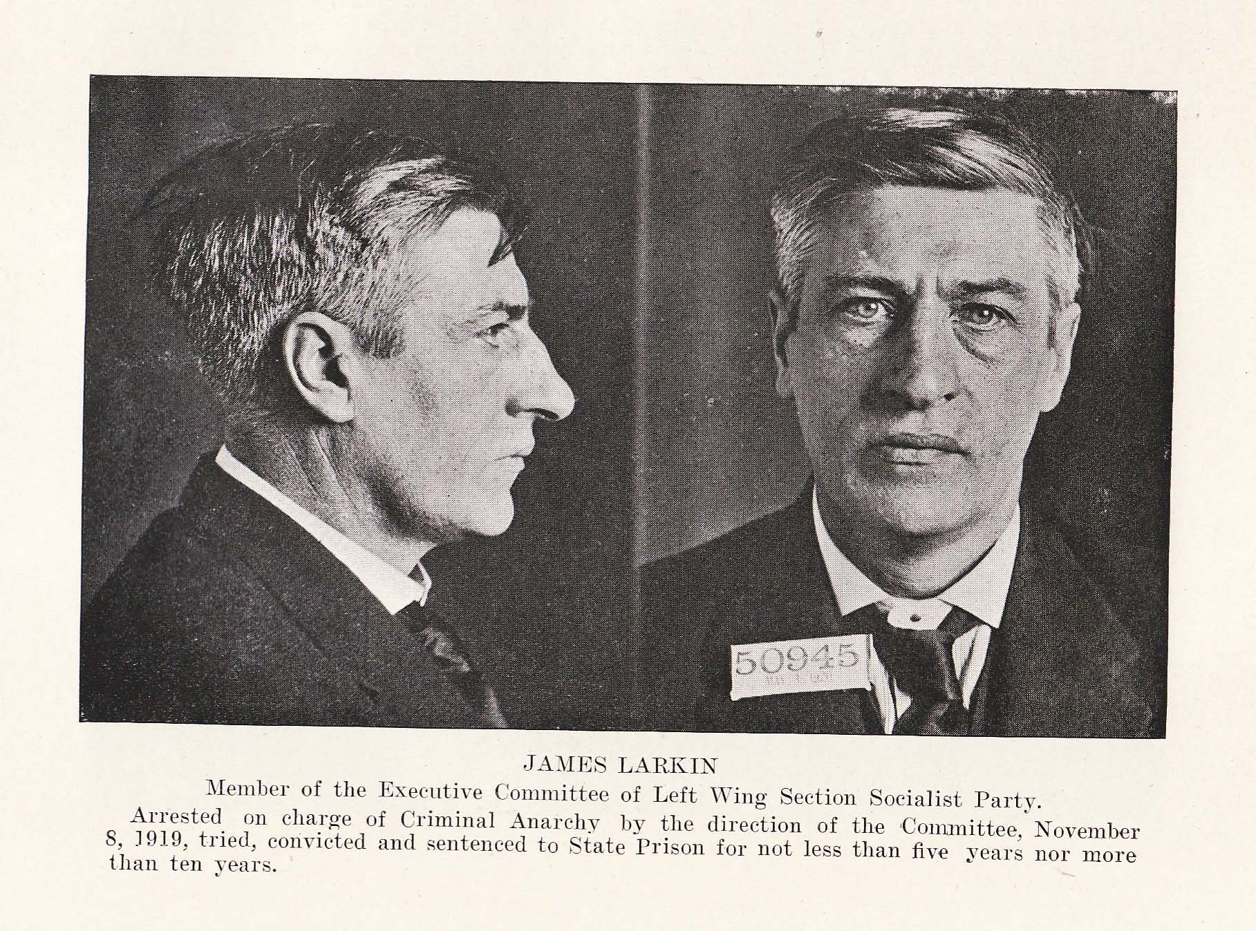 Irish Labour leader James Larkin is arrested in New York charged with criminal anarchy. The indictment states that “Larkin and his co-defendant Benjamin Gitlow were described in the indictment as “men of intelligence, with considerable experience in public affairs, and all this either from honest fanaticism, gross egotism, venomous class hatred, criminal ambition, conceited ignorance on great subjects, or muddled thought they have perverted into the most dangerous channels. As they stand today, as against the organized government specified in this statute, they are positively dangerous men.” He was sentenced to 5-10 years in jail but was pardoned in 1923.